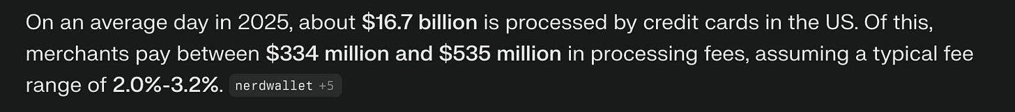 Which firms might be prime beneficiaries from this daily $500M cash cow in the going forward US Stablecoin hegemonic world? Will Visa and Mastercard hold on to their TAM or will it be “penetrated” by Circle and Kraken? Or will the HNICs at JP Morgan and other GSIBs landgrab the lion’s share?