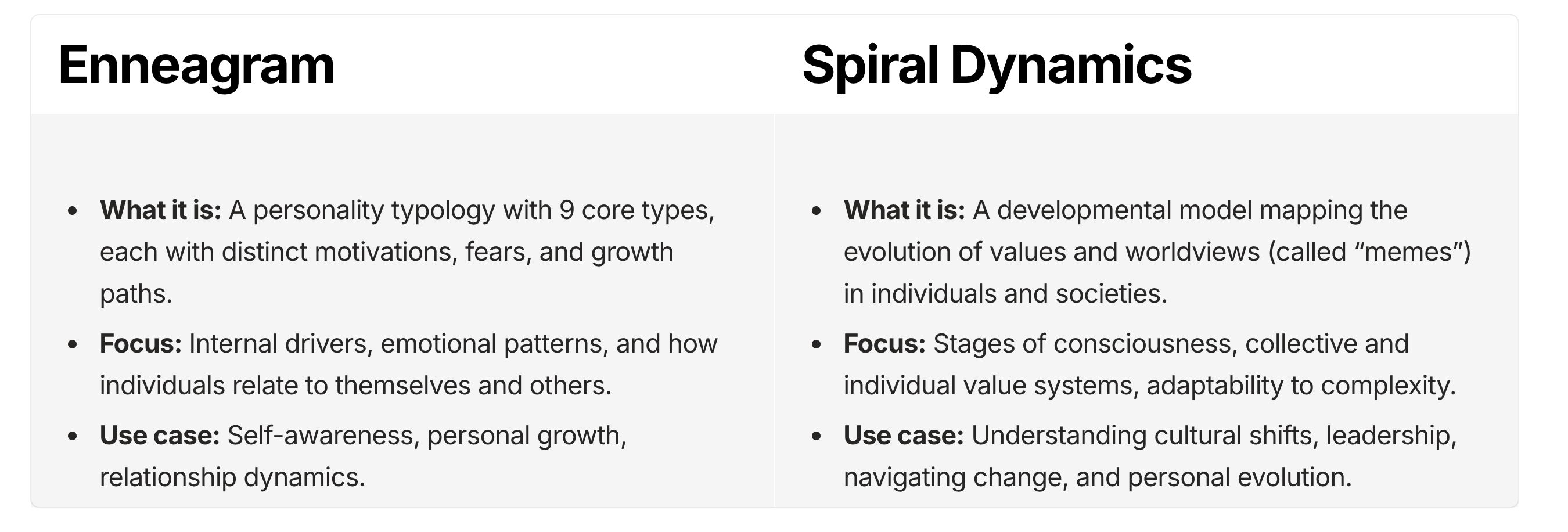 I must confess I never heard about Enneagram until Sara told me about and I never heard about Spiral Dynamics until Jordan told me about that.