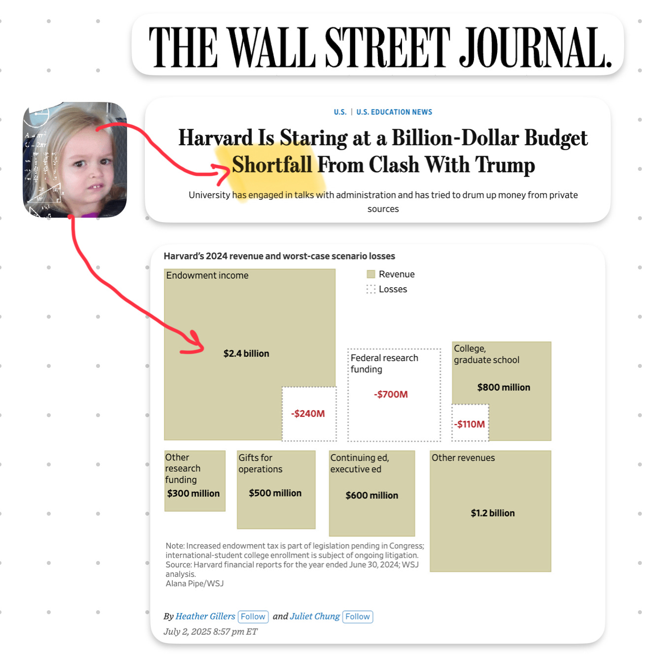 Last time I checked Harvard’s alumni network is a who’s who of moguls, senators, and ex-cons. A single “Save Our Research” gala could raise $1B in a weekend.
