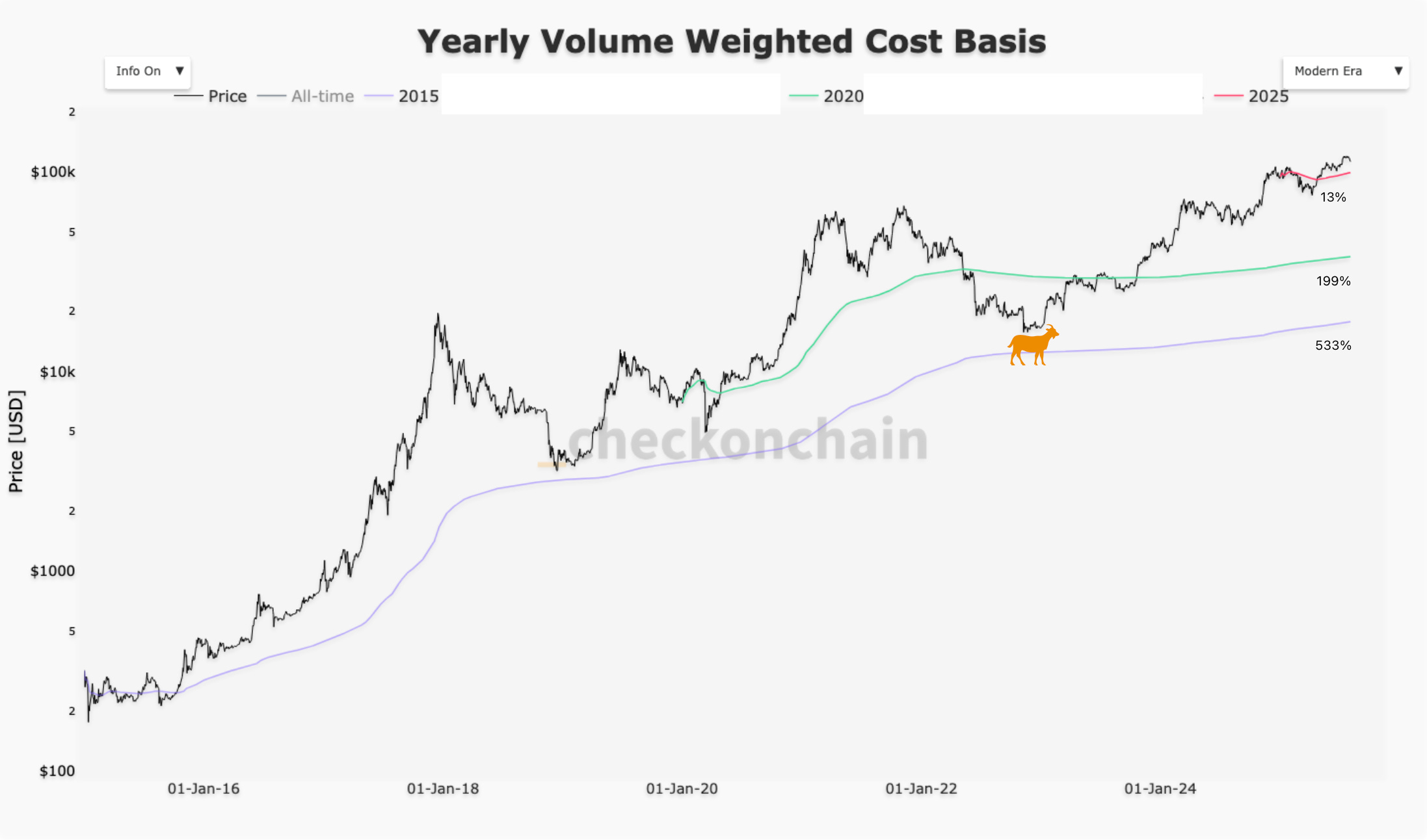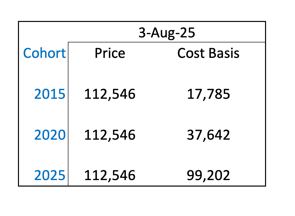 The above chart details the volume-weighted-cost-basis of bitcoin purchased in the years: 2015, 2020 and 2025.