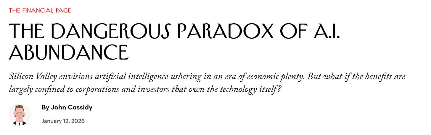 John Cassidy wrote a punchy piece about AI abundance and how it might create value for new entrants in ways the oldies cannot easily imagine … or tax.
