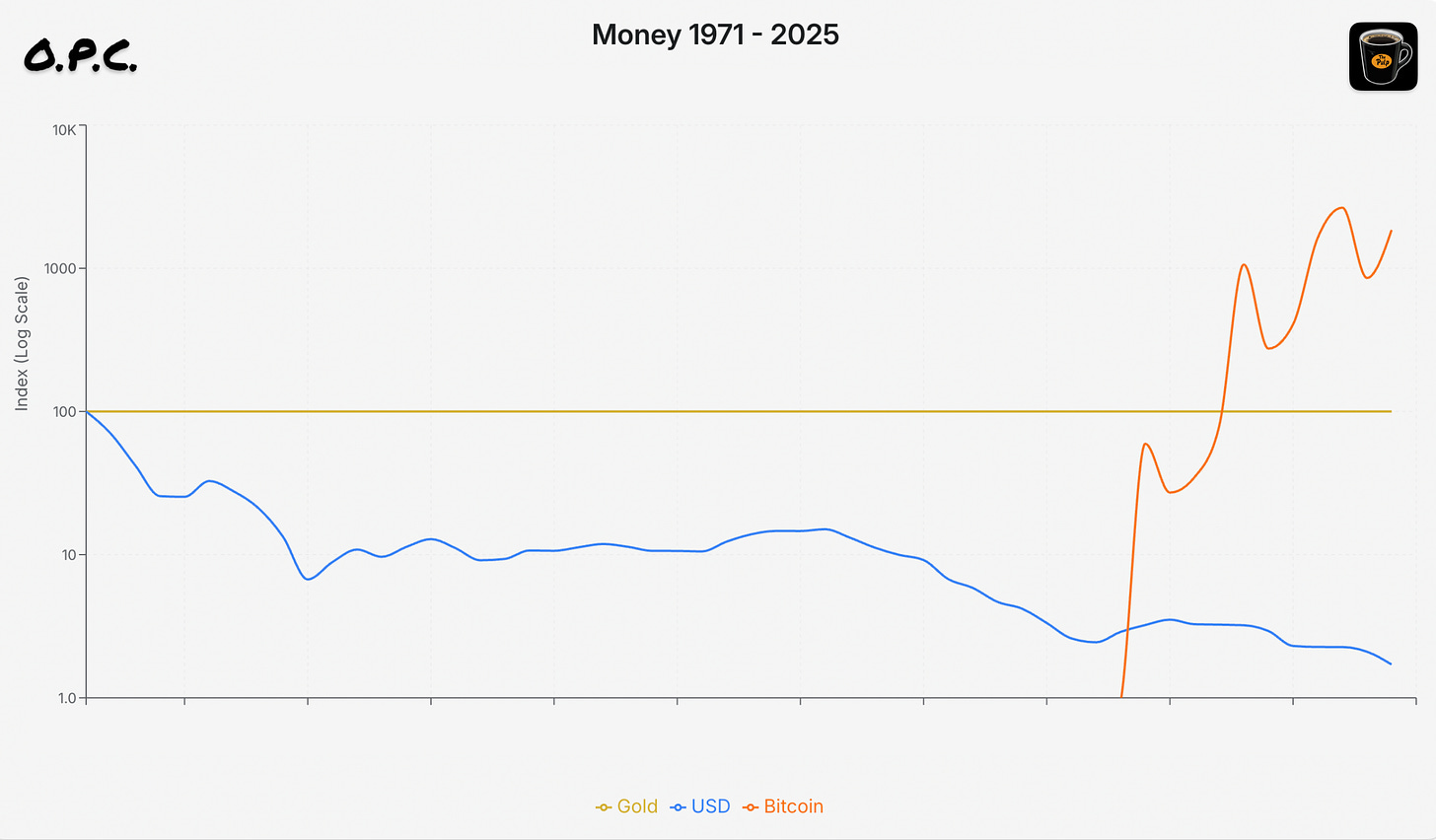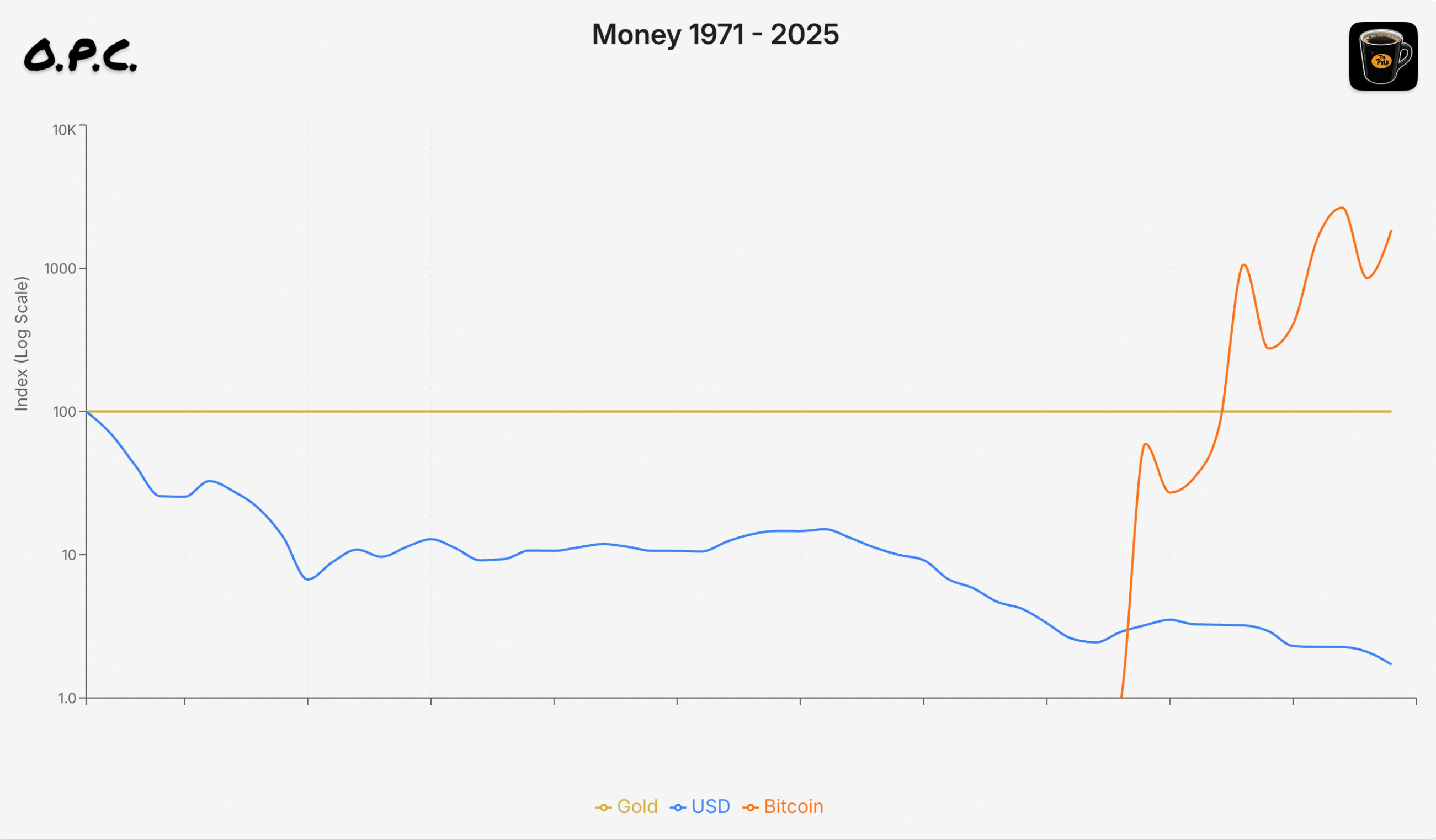 USD: the king of convenience, liquidity, and medium-term stability. But it’s a leaky bucket. Diluted by monetary policy, debased by deficit spending, and blown-up by occasional bailouts (👋🏽 Covid).