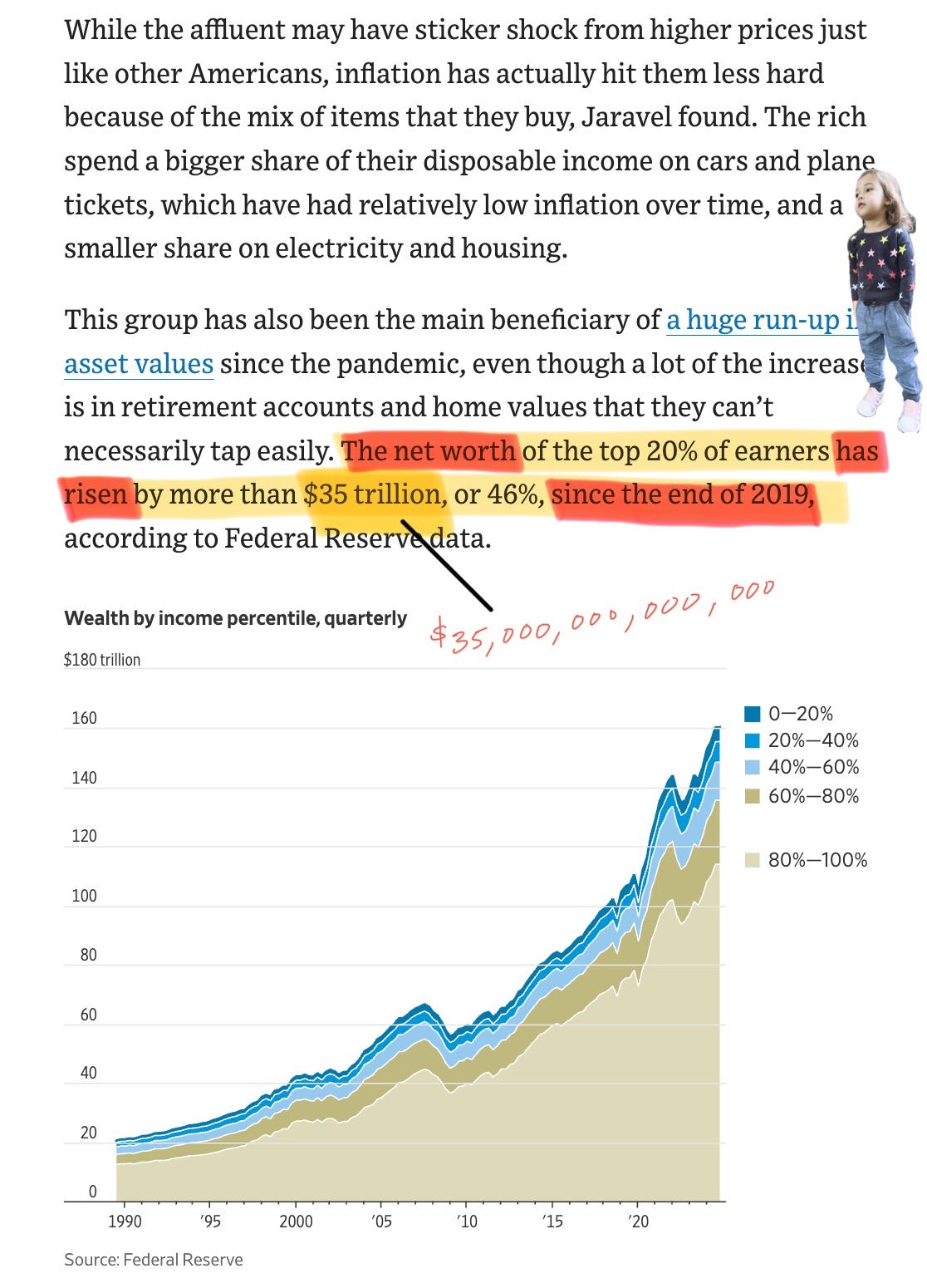 The $35 trillion net worth gain for the top 20% almost mirrors the $6.6 trillion M2 surge when you consider leverage, asset price multipliers, and the fact that most new money flows to those already holding assets.