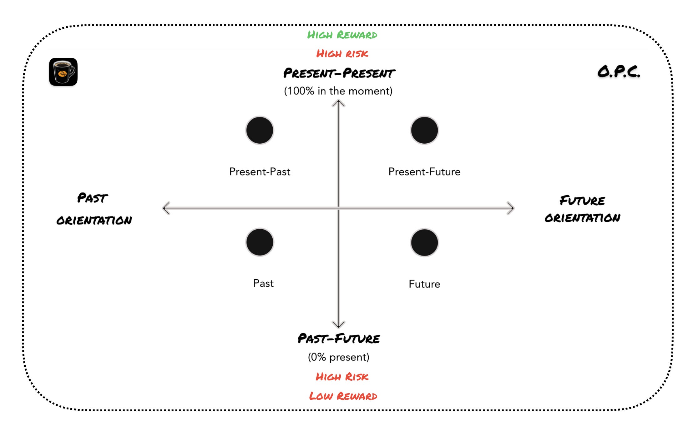 This framework is influenced by Phil Zimbardo; mapping how people experience time. As you move higher up the map, individuals converge toward being “Present-Present”, fully immersed in the now, like extreme athletes such as Alex Honnold.